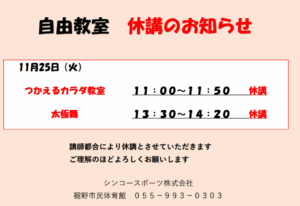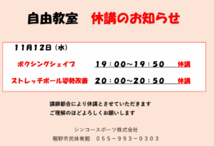 【裾野市民体育館】自由参加教室 休講のお知らせ