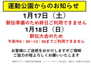 1月17日(土)と18日(日)の営業は駅伝大会のためご利用できません。